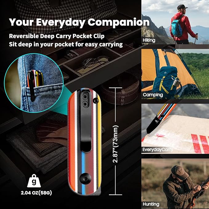 - Eye-catching Colored Handle: The eye-catching G10 handle of the small folding knife features Serape stripes, setting it apart from the rest. The G-10 handle scales provide an exceptional tactile experience, ensuring a comfortable grip like no other.