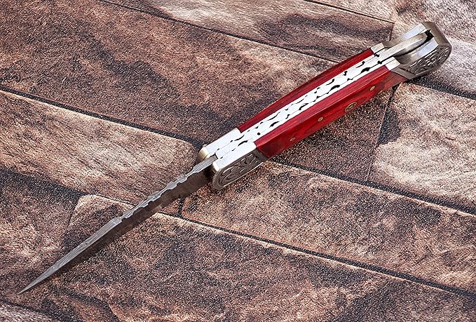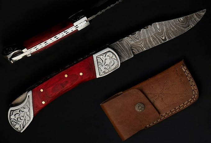 9" long back lock Folding Knife, 2 tone Red wood Scale with Engraved steel bolster, custom made 4" Hand Forged Damascus steel blade, Cow hide leather sheath with belt loop (Red)