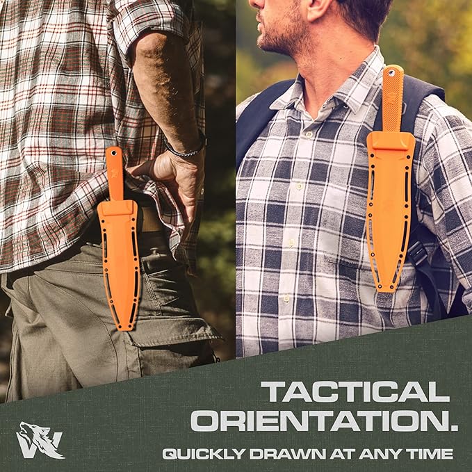 - POLYPROPYLENE SHEATH - This tactical knife with sheath comes in a hard sheath made of polypropylene and can be securely locked in it. The sheath can be comfortably hung on your belt. Always safe and handy when you need the belt fixed blade knife.