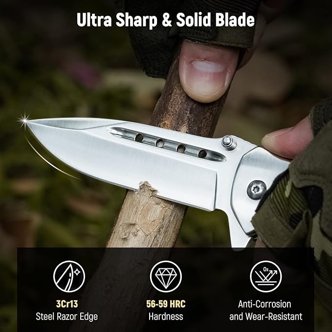 - Designed with Utility and Safety: Well-designed with a simple finger flipper, ambidextrous thumb stud, and reliable liner lock, the knife ensures effortless one-handed opening and is equipped with a glass breaker for various emergency escapes