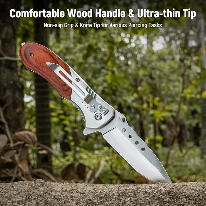 - Wood Handle Pocket Knife: This camping survival knife for men tactical comes with a handle that features vintage rosewood and finger indentions for a comfortable, secure, and solid grip when in use