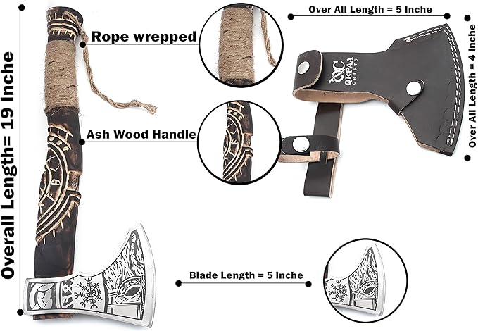 - [SPECS AND MATERIAL]: Survival hatchet is made of high quality 1095 carbon steel semi-sharp blade width of 5'' inches, length of 4'' inches, and Rosewood Handle of 19'' with perfect hold and stable axe. The Viking-style axe is designed beautifully for both exhibit and functionality.
