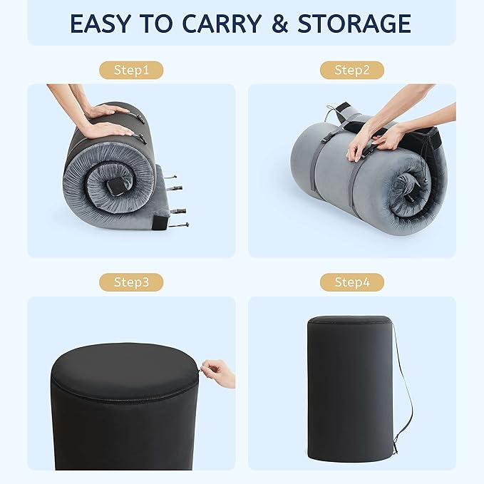 - Portable and Easy to Clean: Designed for life on the go, our portable floor mat rolls up compactly with straps and features a durable zipper for easy cleaning; The removable, washable cover and travel bag make storage and transport a breeze. Adjustable, flexible straps and a complimentary storage bag make it easy to roll up your mattress and immediately head to your next travel destination
