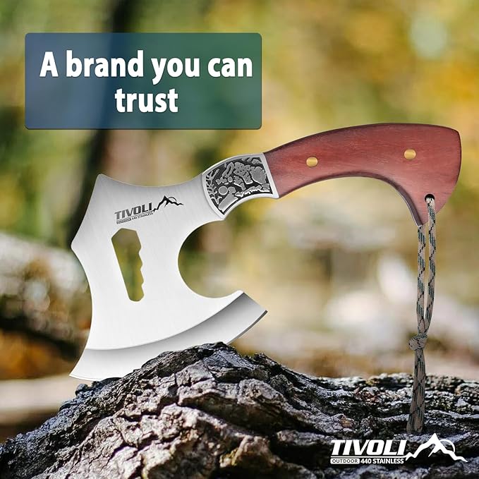 - Multifunctional hatchet -The TIVOLI camping axe is a small, lightweight axe that can be used for chopping wood and other camp tasks. It is smaller than a full-grown axe, but larger than the average pocket knife. TIVOLI camp hatchet are made from high quality steel and have comfortable handles so you don't have to worry about blisters or calluses if you use them all day.