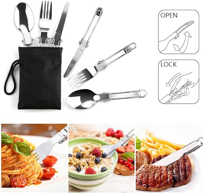 - FOLDING HANDLE & STORAGE BAG - The pan and the pot in the set are equipped with foldable portable handles for further space saving. In addition, the mesh bag that comes with it can pack everything in the set and store it away for you to carry.