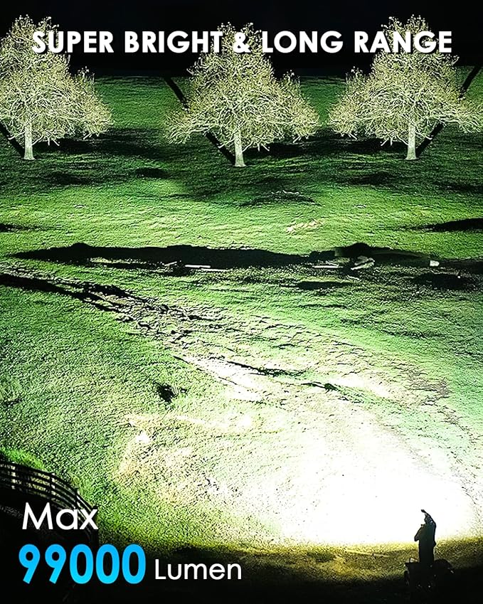 - 99000 Lumens Flashlight: Our flashlights high lumens is equipped with a upgraded chip, offering a 30% performance improvement. The flashlight has an astonishing output power of up to 99000 lumens, which is 20 times brighter than a regular LED flashlights
