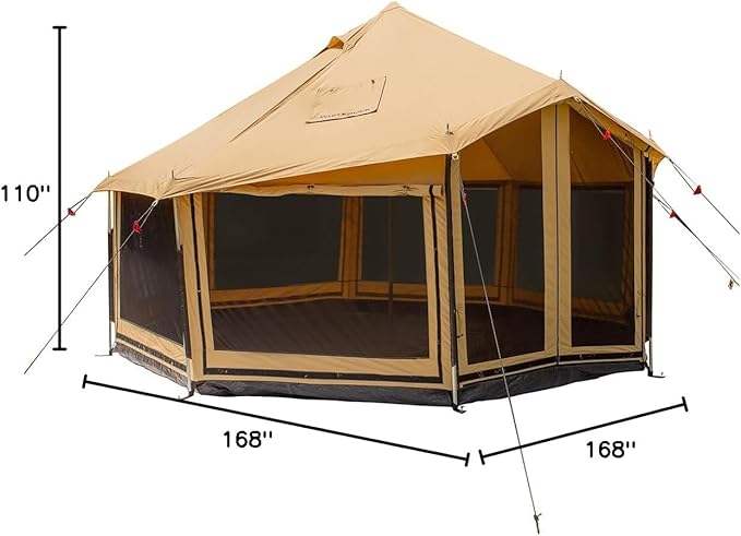 - 【EXTREMELY SPACIOUS GLAMPING TENT】 This yurt tent has a spacious design with standard wall height of 4'5" which is higher than average bell tent wall heights. The super spacious interior boasts tons of stand-up space and walk-around comfort. The Altimus comes in 2 sizes, perfect for your group of any size.