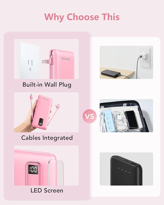 Charmast Portable Charger with Built-in Cables & Wall Plug, 10000mAh Portable Power Bank, External Battery Pack Travel Essentials Compatible with iPhone 16/15/14/13, Samsung, iPad etc