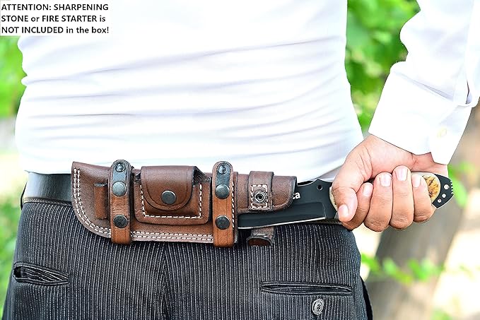 Ottoza Fixed Blade Hunting Knife with Leather Sheath and Horizontal Carry - Full Tang Outdoor Survival and Camping Knife for Men - Ram Horn Handle 353