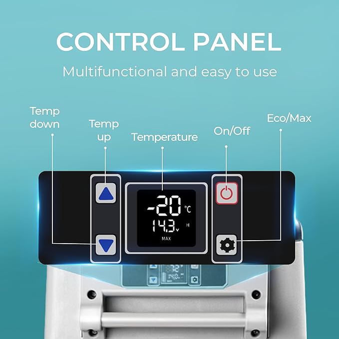 - User-Friendly Design & LCD Panel; This portable cooler is equipped with a removable handle for easy portability. The 12v fridge includes a simple LCD control panel for easy temperature adjustments. An internal LED light design makes the 12 volt fridge convenient to access your food at night