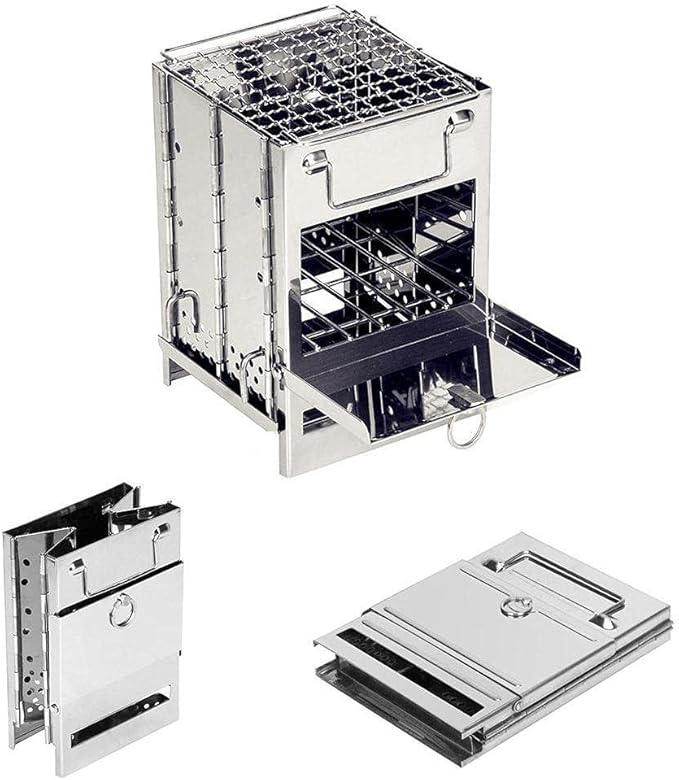 Foldable Camping Wood Burning Stove with Grill, Camp Stove Collapsible Backpacking Survival Stove Stainless Steel Campfire Stove for Outdoor Cooking Picnic Hiking BBQ (Sliver-Large)