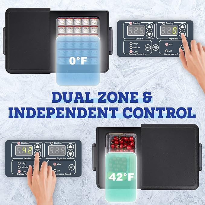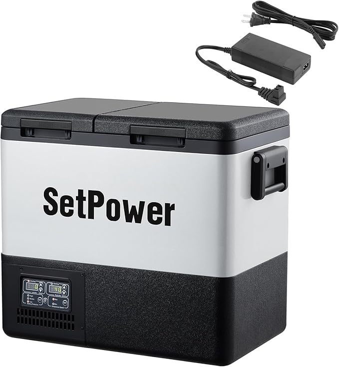 - Dual Zone And Dual Temperature Control Electric Cooler: Setpower 12 Volt Refrigerator is equipped with a "true dual zone design" to avoid flavor transfer and mutual contamination of food between the two zones.And,this portable freezer can be independently controlled from 50°F to 0°F via the LCD panel.You can get a refrigerator and a freezer at the same time