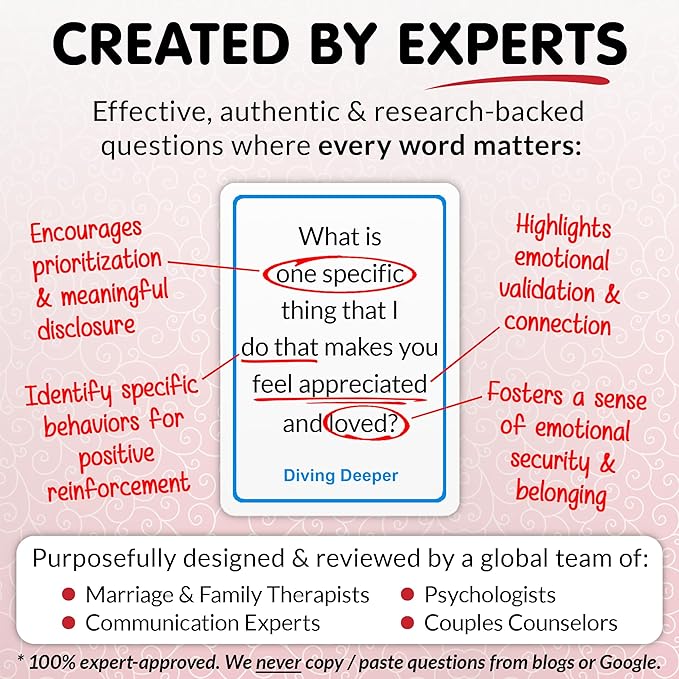 - Awaken Gratitude and Appreciation: Take a delightful stroll down memory lane. By answering open-ended questions about your history of love, you’ll find yourselves instantly feeling closer together. Perfect portability for weekend getaways, camping trips, or other outings, these durable cards are protected from humidity and frequent use