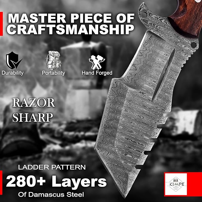- MATERIALS: - Composed of 1095 and 15N20 High Carbon steel, folded 5 times, starting from 9-layers into a ladder pattern of 288+ layers of Damascus steel. Shatter proof to withstand any hunting task.