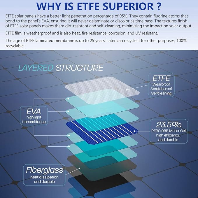 - 3. Backboard: Durable fiberglass substrate backboard, better heat dissipation than PET backboard which ensures a long lifetime. ETFE film and fiberglass backboard can withstand extreme environmental conditions, maintenance-free for years.