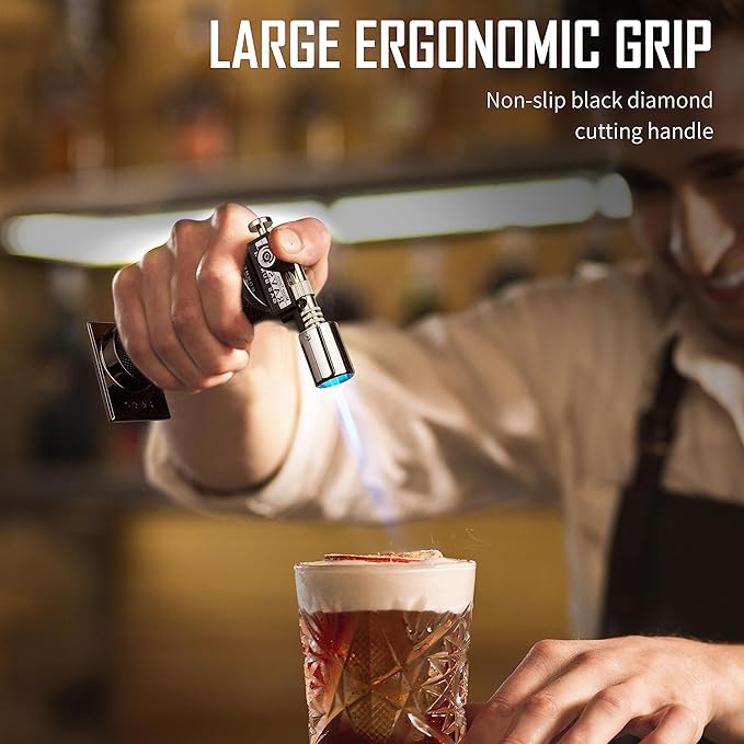 - [ Well-made ] The black diamond cut handle has a nice texture that offers a great grip and stays cool. The large diameter nozzle of the torch lighters butane refillable ensures flame strength and can be used for various occasions. The wide base provides excellent support and anti-tipping to the creme brulee torch body.