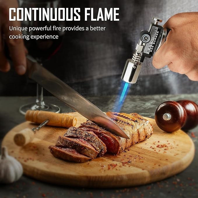 - [Multi-propose Culinary Torch ] Up to 1372¡æ/2500¨H temperature with adjustable flame, this multipurpose cooking blow torch is not just a kitchen torch for baking, sous vide, searing meat, or barbecue. The small butane torch also works for soldering, crafting, and jewelry DIY. It is a portable mini torch that you can take for many outdoor activities like camping and BBQ.