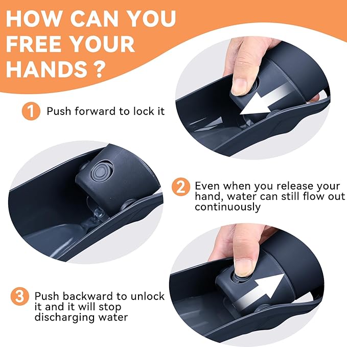 - Easy to Use & Recyclable Water: Quickly turn over the leaf-shaped dog water bowl, then press the button to allow water flow and quench your doggie's thirst. Press the button and push it forward to lock it, and the water will flow out continuously. After drinking, press the button and tilt back, excess water will flow back into the bottle. This helps reduce water waste.