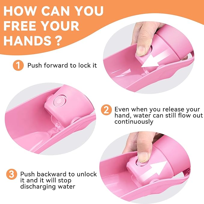 - Easy to Use & Recyclable Water: Quickly turn over the leaf-shaped dog water bowl, then press the button to allow water flow and quench your doggie's thirst. Press the button and push it forward to lock it, and the water will flow out continuously. After drinking, press the button and tilt back, excess water will flow back into the bottle. This helps reduce water waste.