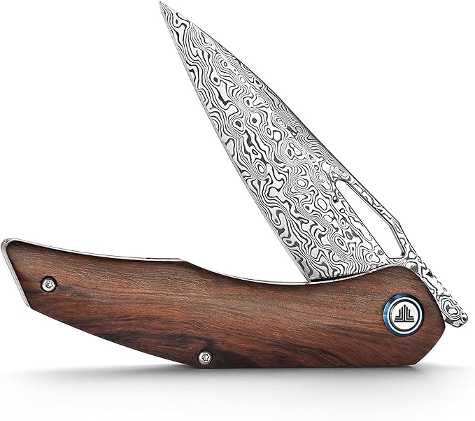 - This 110 layers Damascus steel-made pocket folding knife has a unique, high-quality natural ironwood handle secured with a secure liner lock, designed with attention to detail to provide a comfortable grip and hand control while eliminating blade wobble up and down, making tough jobs more manageable and highly protective of the user during use.