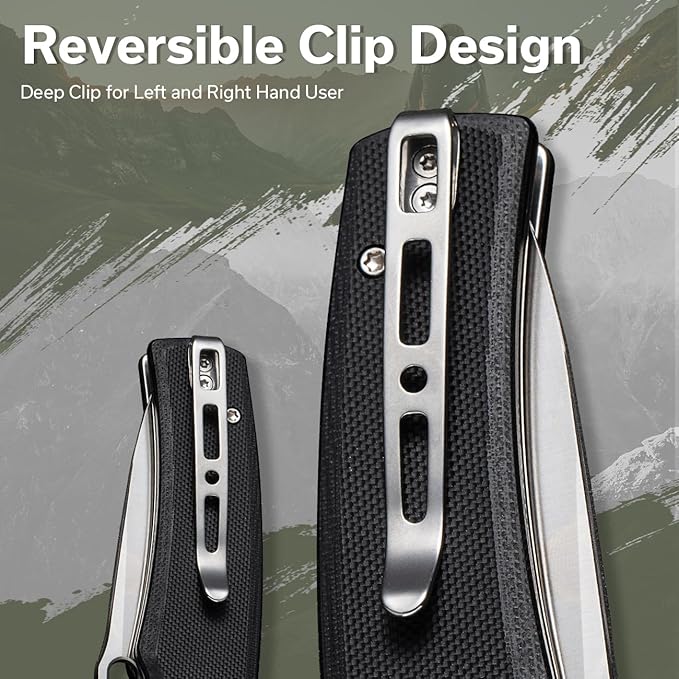 - [Convenient Portability] Featuring a spectrum of colors, the handle integrates a reversible pocket clip for versatile carrying. The camping knife with a reversible deep carry clip for effortless tip-up left or right-hand use.