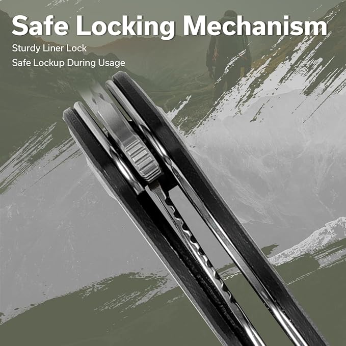 - [Confidence in Secure Locking] Folding knife proudly features a stalwart, trustworthy locking mechanism. Enhanced by a caged ceramic ball bearing pivot assembly, the liner lock mechanism ensures both secure usage and effortless deployment.