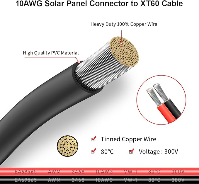 - [Solar Panel Cable] This XT60 to Solar Panel Connector Cable use 10AWG Tined Copper UL2468 Certified Wire with high quality PVC nylon material. Tined Pure Copper has low resistance, antioxidant, anti-corrosion and good electrical conductivity, providing stable current for your device.