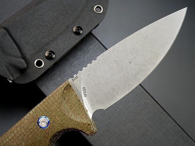 - Ergonomical Micarta Handle: Exquisite Micarta handle scales is anti-slip and stylish looking,Ergonomical design provides a very comfortable grip, plus a nice thick full tang, ensure a great balance and powerful strength, compact handle heavy style fixed knife is suitable for cutting and puncturing,with a perfect curved finger choil and finger guard can ensure a safety using in heavy works.