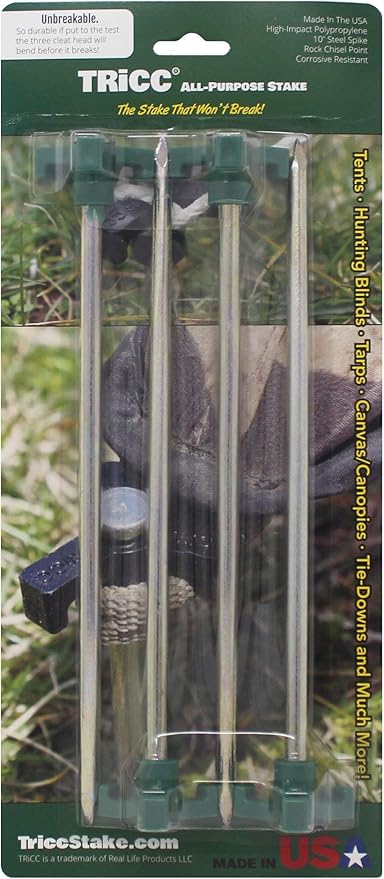 Tricc Unbreakable Heavy Duty Steel Tent/Canopy Stakes, Galvanized Non-Rust 10" Three Pegged Solid, Sturdy Stakes for Outdoor Trips, Camping, Hiking & Gardening. 4 Colors Made in The USA (Green)