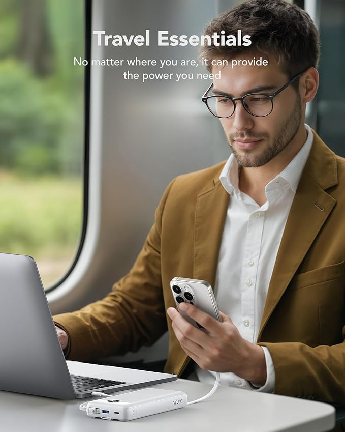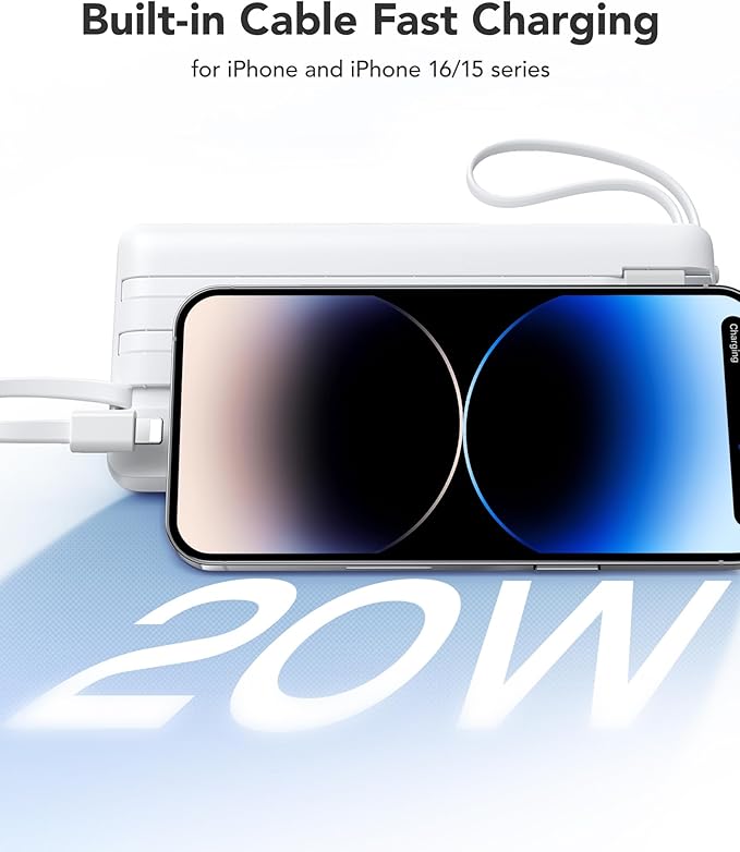 VRURC Portable Charger with Built in Cables 20000mAh, 22.5W Fast Charging USB C Power Bank,LED Display Charging Back with 4 Output 2 Input for iPhone 15/14/13/Pro,Samsung,Android-White(1 Pack)