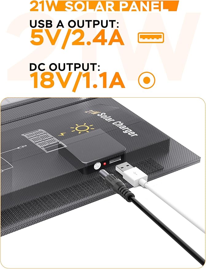 - WIDE COMPATIBILITY: The USB A and DC ports are built into the power box of the MARBERO 21-watt portable foldable solar panel charger, making it perfect for charging your smartphones, tablets, laptops, power bank, speaker, portable power stations, and more. This portable solar panel, designed for camping and outdoor use, offers a reliable solar panel charging solution wherever you go, whether you're using it as a camping solar panel or for general on-the-go power needs. Our portable solar charger can't store electricity and can't charge laptops and power station.