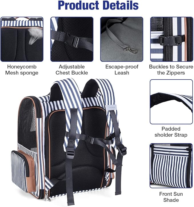 Lekebobor Extra Large Cat Backpack Carrier Expandable Pet Carrier Backpack for Small Dogs Medium Cats Fit Up to 18 Lbs, Dog Backpack Carrier, Foldable Puppy Backpack Carrier for Travel, Hiking,Striped