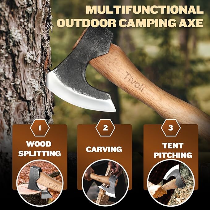 Tivoli 15 Inch Camping Axes and Hatchets, Bushcraft Axe for Wood Splitting and Kindling,Hand Forged Carbon Steel Chopping Axes Ash Wood Handle with Sheath for Camping and Survival