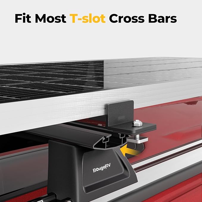 - Exclusive Fit: BougeRV T-slot solar mount kit is designed only for vehicle roof rack crossbars with T-track channels. The included M6 T-bolts are compatible with most T-shaped roof racks, and the interior rubber padding ensures protection from damage