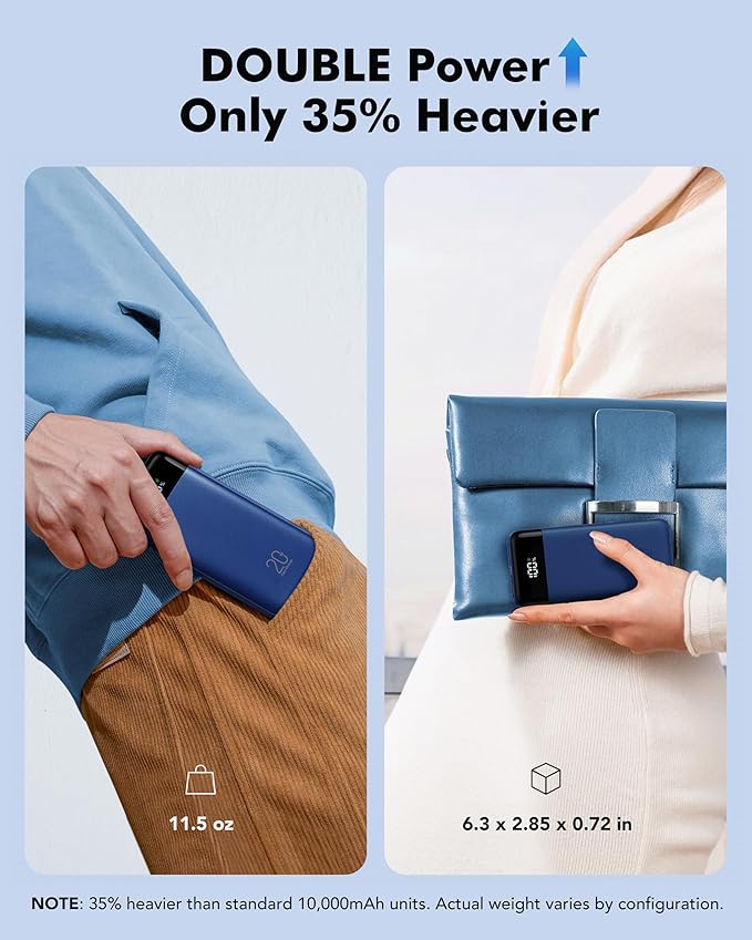 - Double the Power, Only 35% Heavier: Battery pack 20,000mAh (2X capacity of standard chargers) in just 6.3 x 2.85 x 0.72 in - only 35% heavier than 10K models but holds twice the energy. Fits anywhere a paperback book would.