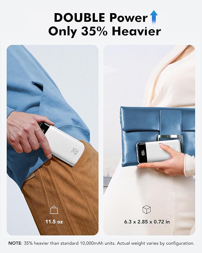 - Double the Power, Only 35% Heavier: Battery pack 20,000mAh (2X capacity of standard chargers) in just 6.3 x 2.85 x 0.72 in - only 35% heavier than 10K models but holds twice the energy. Fits anywhere a paperback book would.
