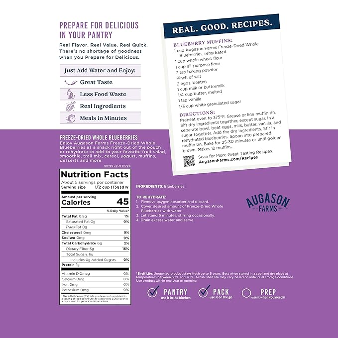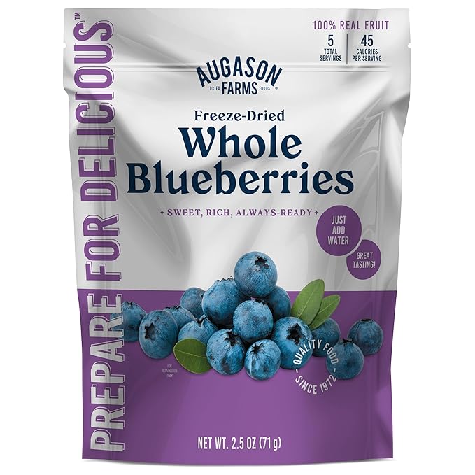 - You’ll love these healthy Augason Farms Freeze Dried Whole Blueberries. Reconstitute with a little water and enjoy them in pancakes, muffins, cheesecake, or to add flavor to your granola. They’re also great for 72-hour kits and long-term food storage.