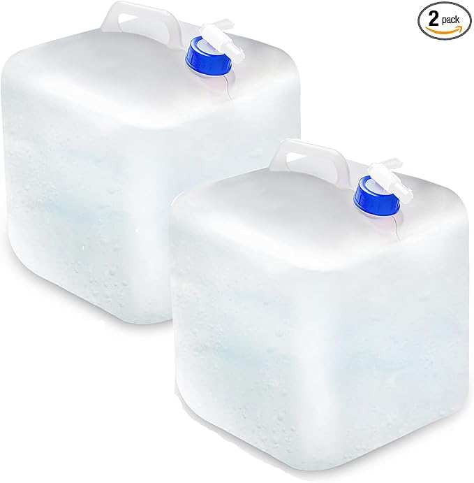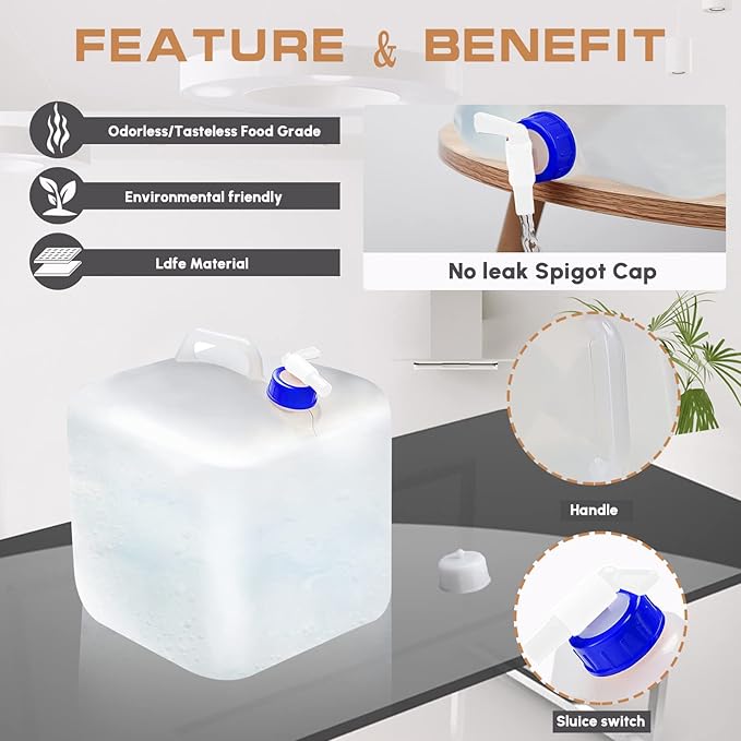 - Our collapsible water container packed with 2pc to avoid accident damage and daily change.The spigot is easy to on and off with no seams to leak or handles to break.