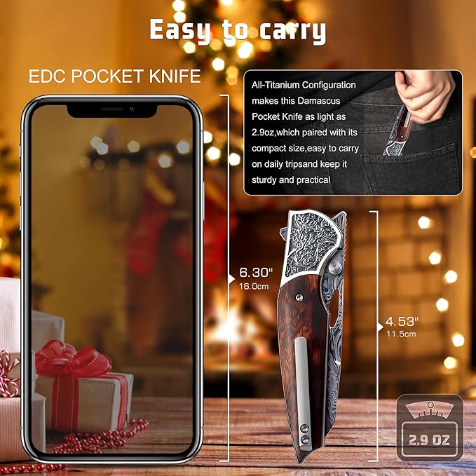 - New Damascus Texture:Pocket Knife blade is forged from 110 layers of Damascus and features the latest Damascus blade texture. The surface is hand ground and polished for excellent corrosion resistance and edge retention, and the sharp cutting edge makes it easy to handle everyday tasks