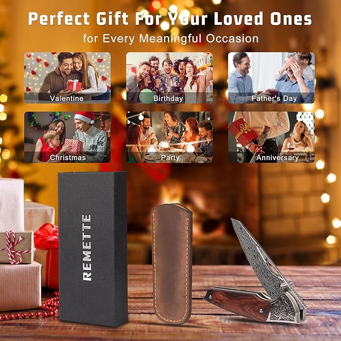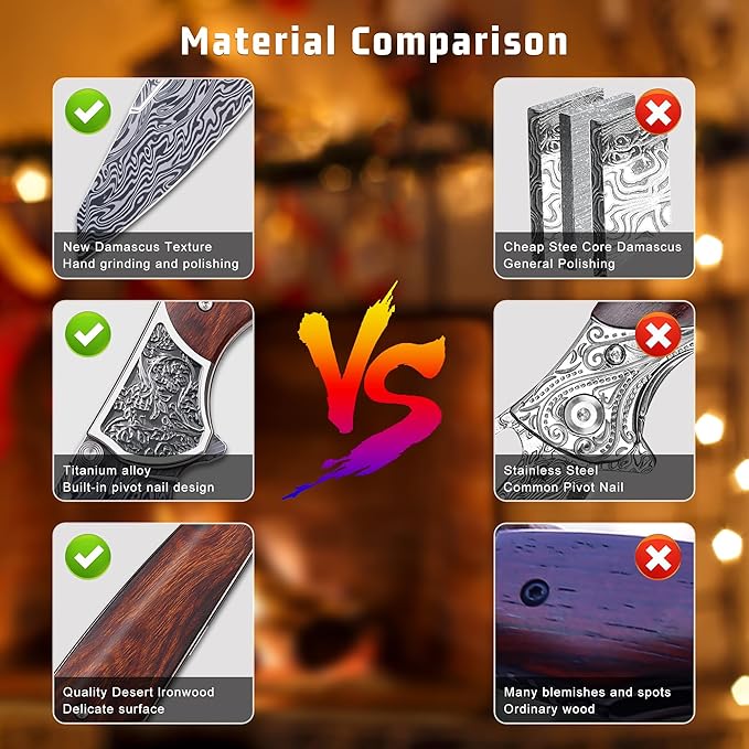 - Desert Ironwood Handle:Ergonomic, high natural luster, the material is very stable, comfortable and delicate to hold, with charming texture, with damascus blade and titanium alloy structure, highlighting its high-end feeling, a good choice for gifts.