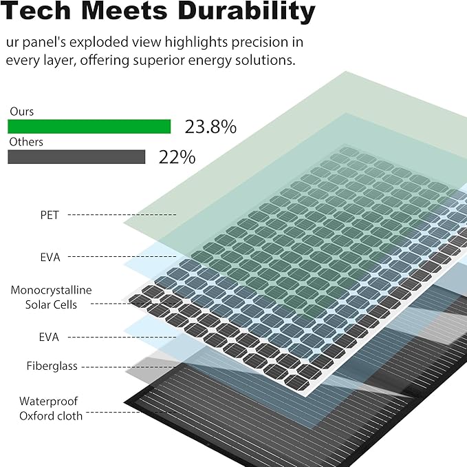 - Enhanced Energy Efficiency: Boasting a high energy conversion efficiency of up to 23.8%, our 120w solar panel maximize the utilization of solar energy for all your charging requirements. Their cutting-edge technology is designed to capture the maximum amount of energy from every sunbeam.