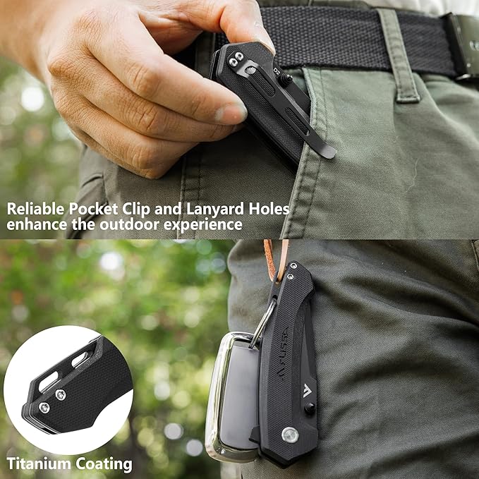 - Sharp Blade: Crafted with premium D2 steel, the blade is precise, sharp, hard, and corrosion-resistant. Moreover, the titanium coating further enhances durability and reduces friction during use, ensuring consistent performance in cutting, piercing, slicing and other outdoor tasks.