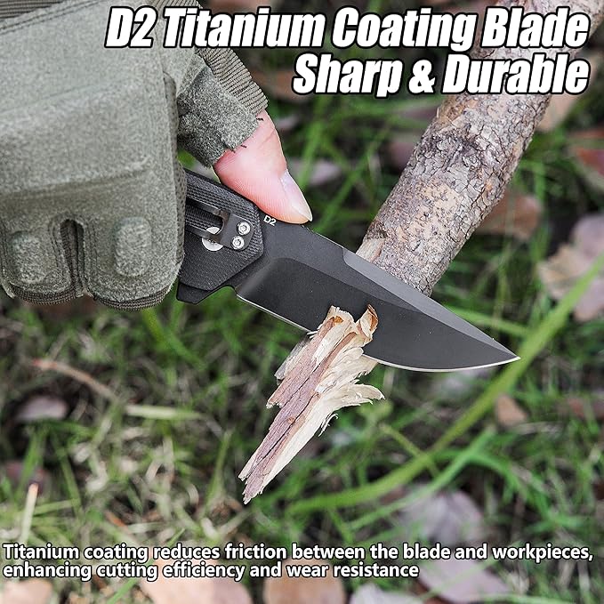 - Sharp Blade: Crafted with premium D2 steel, the blade is precise, sharp, hard, and corrosion-resistant. Moreover, the titanium coating further enhances durability and reduces friction during use, ensuring consistent performance in cutting, piercing, slicing and other outdoor tasks.
