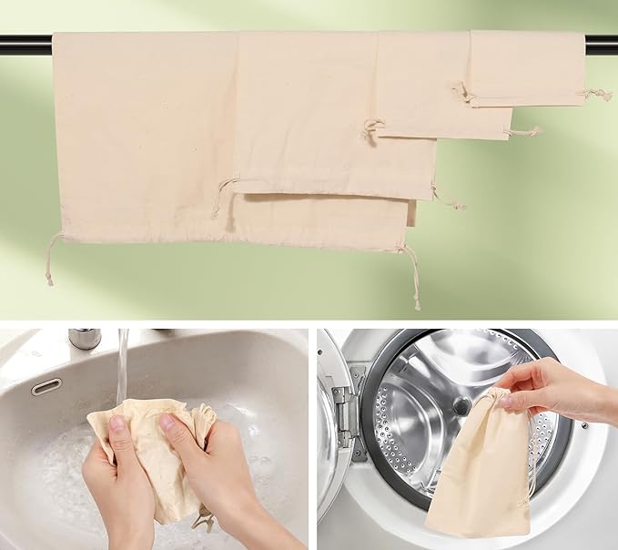 - 5. Drawstring Closure for Convenience: Each bag features a practical drawstring closure, ensuring that your items are secure while providing easy access. The drawstring adds a touch of simplicity and functionality to these reusable muslin storage bags.