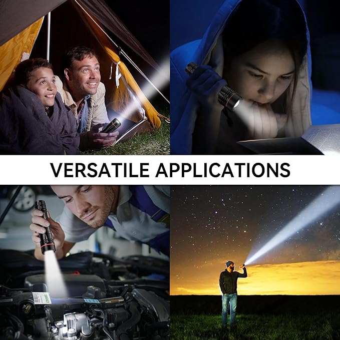 - 2 Pack Tactical Compact Flashlight: These small flashlights with 4.7’’ height and 106g, lightweight enough to carry comfortably and easily fit in your pocket, backpack, purse or car console compartment, ensuring convenient storage and quick access. Keep one at home for emergency backup and another one to use outside, such as dog walking, camping, hiking, fishing, etc