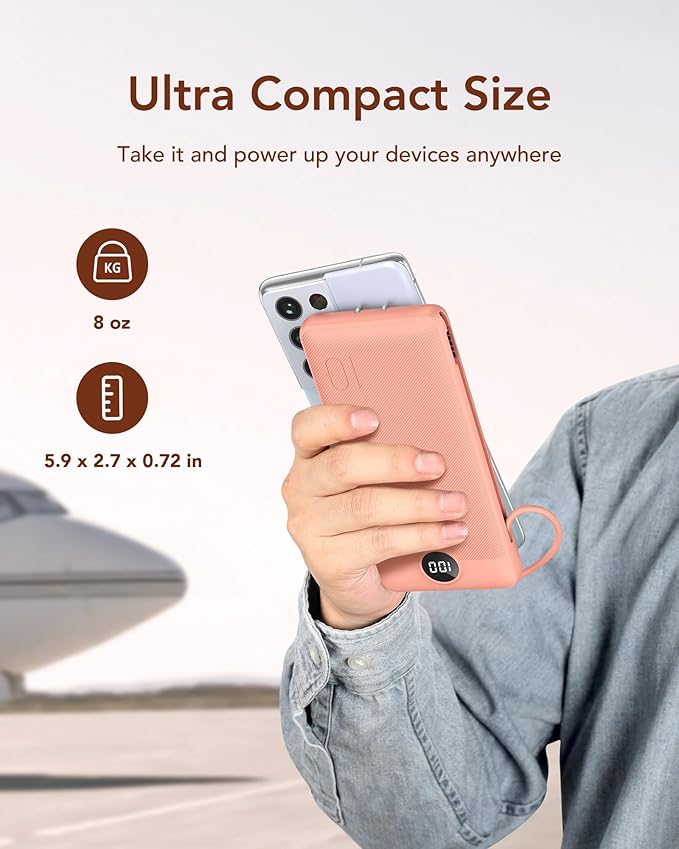 - 【10000mAh Capacity with Slim Body】: With a slim size of 5.9 x 2.7 x 0.72 inch size, 8oz weight, the external battery is a perfect travel accessory. Full 10000mAh Capacity is enough for daily used, which provides charges 1.8 for iPhone15/14, 1.6 charges for Samsung S23.