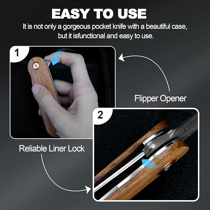 - DAMASCUS POCKET KNIVES: High quality 76 layer Damascus steel blade, its exceptional slicing ability ensures effective performance for a variety of cutting needs. The unique pattern of the Damascus steel blade is exquisite and distinctive, and you will love it