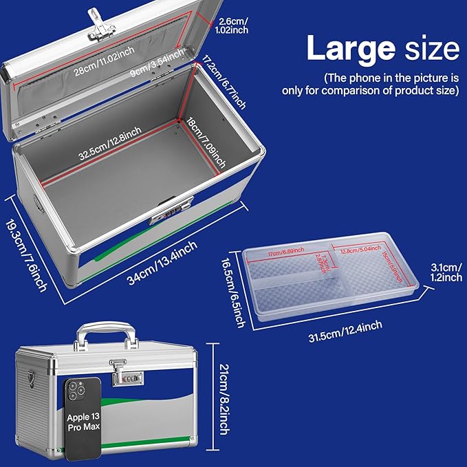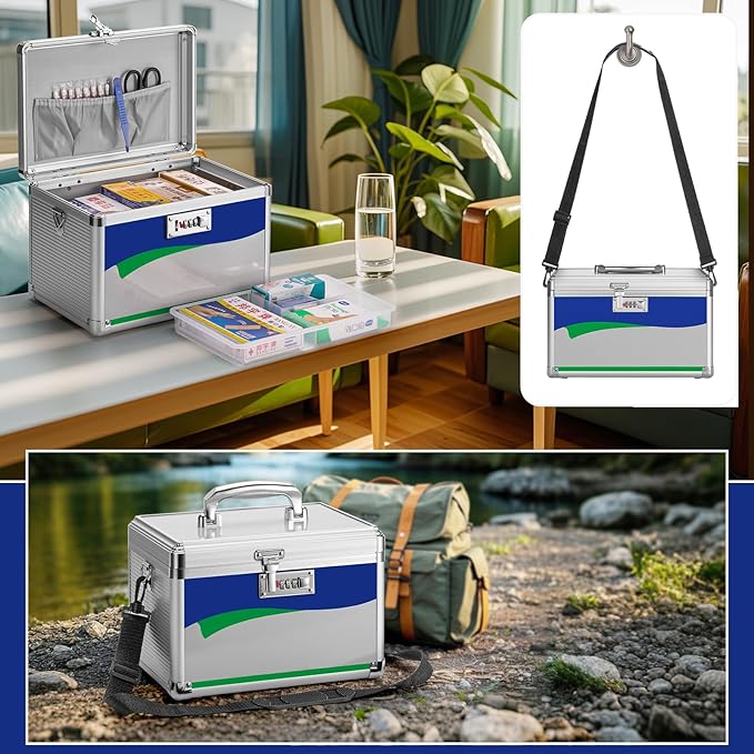 - PERFECT SIZE: Measuring 13.4 x 7.6 x 8.2", Silver & Blue, unique combination lock + shoulder strap. our locked medicine box can store up to 16-18 standard-sized pill bottles or any other small first aid