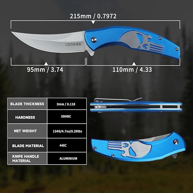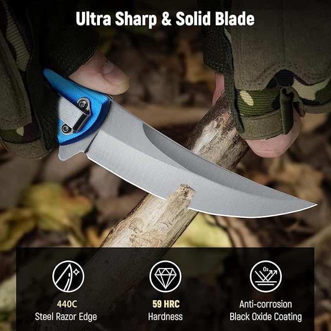 Tactical Folding Knife with upswept 440C High Carbon Stainless Steel Blade, Blue Aluminum Handle, with Deep Carry Pocket Clip, Outdoor EDC Knife for Camping, Hiking, Fishing