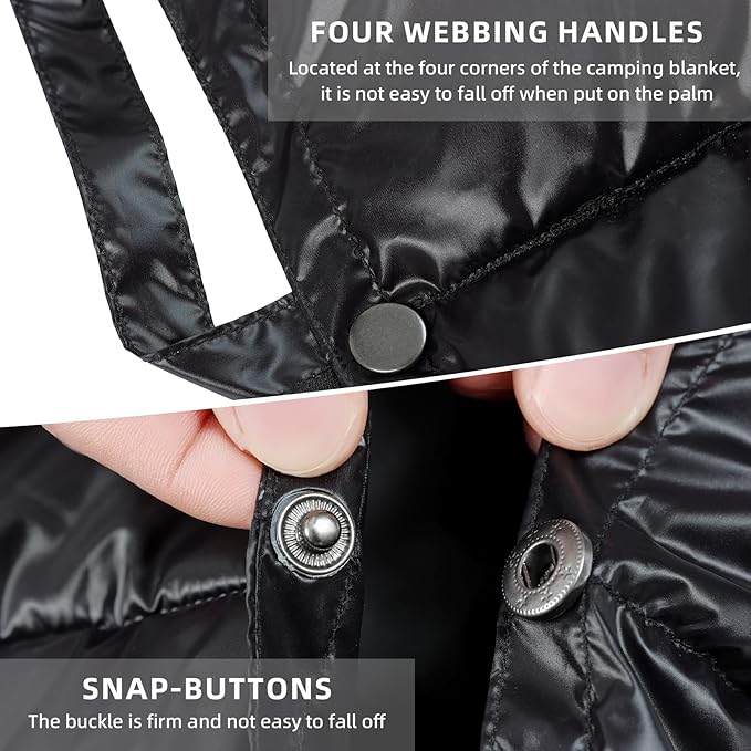 - INNOVATIVE DESIGN: The warm camping blanket is equipped with elastic back straps for effortless portability. It features a drawstring at the foot and multiple side snap buttons, allowing it to easily convert into a down sleeping bag, providing added functionality and versatile usage. And it can also double as a camping quilt. Additionally, U-shaped straps at each corner offer secure fastening options, making it adaptable to various outdoor setups